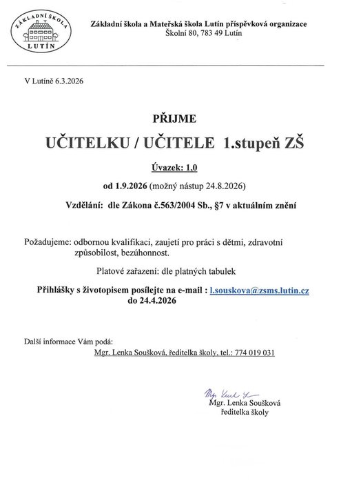 Úvod > Život v obci > Aktuality > Nabídka práce - učitel/ka 1. stupně ZŠ