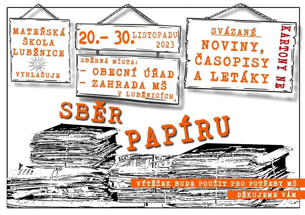 Mateřská škola Luběnice pořádá sběr papíru, a to letáky, časopisy, noviny, vše svázané lze uložit na zahradě školy nebo do chodby Obecního úřadu v Luběnicích. Termín sběru papíru od 20. do 30. listopadu 2023. Kartony prosím nedávat.